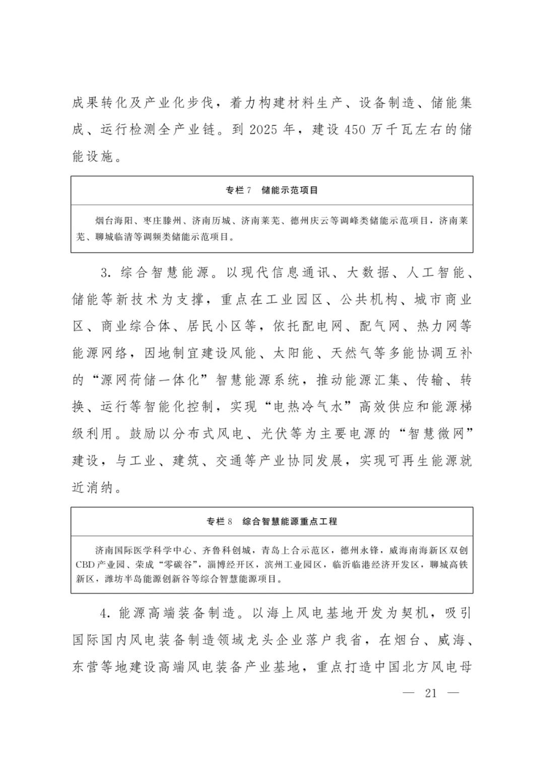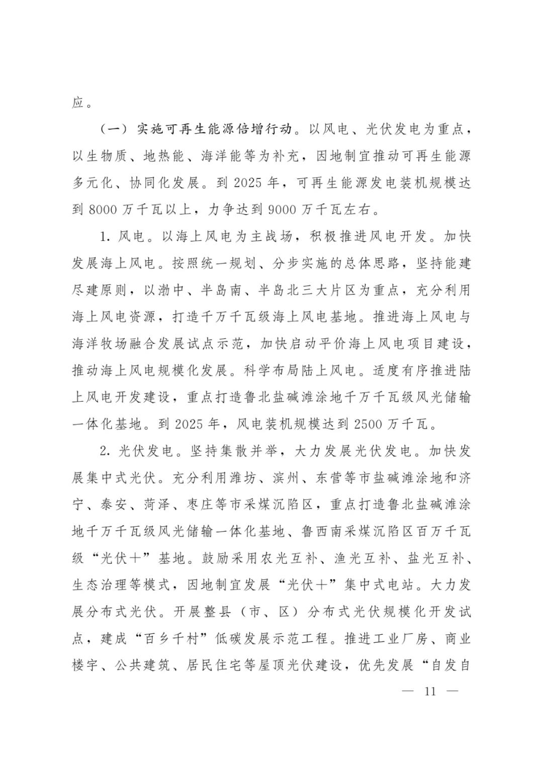 推进海上风电与海洋牧场融合发展试点示范,加快启动平价海上风电项目建设,推动海上风电规模化发展。科学布局陆上风电。适度有序推进陆上风电开发建设,重点打造鲁北盐碱滩涂地千万千瓦级风光储输一体化基地。到2025年,风电装机规模达到2500万千瓦。