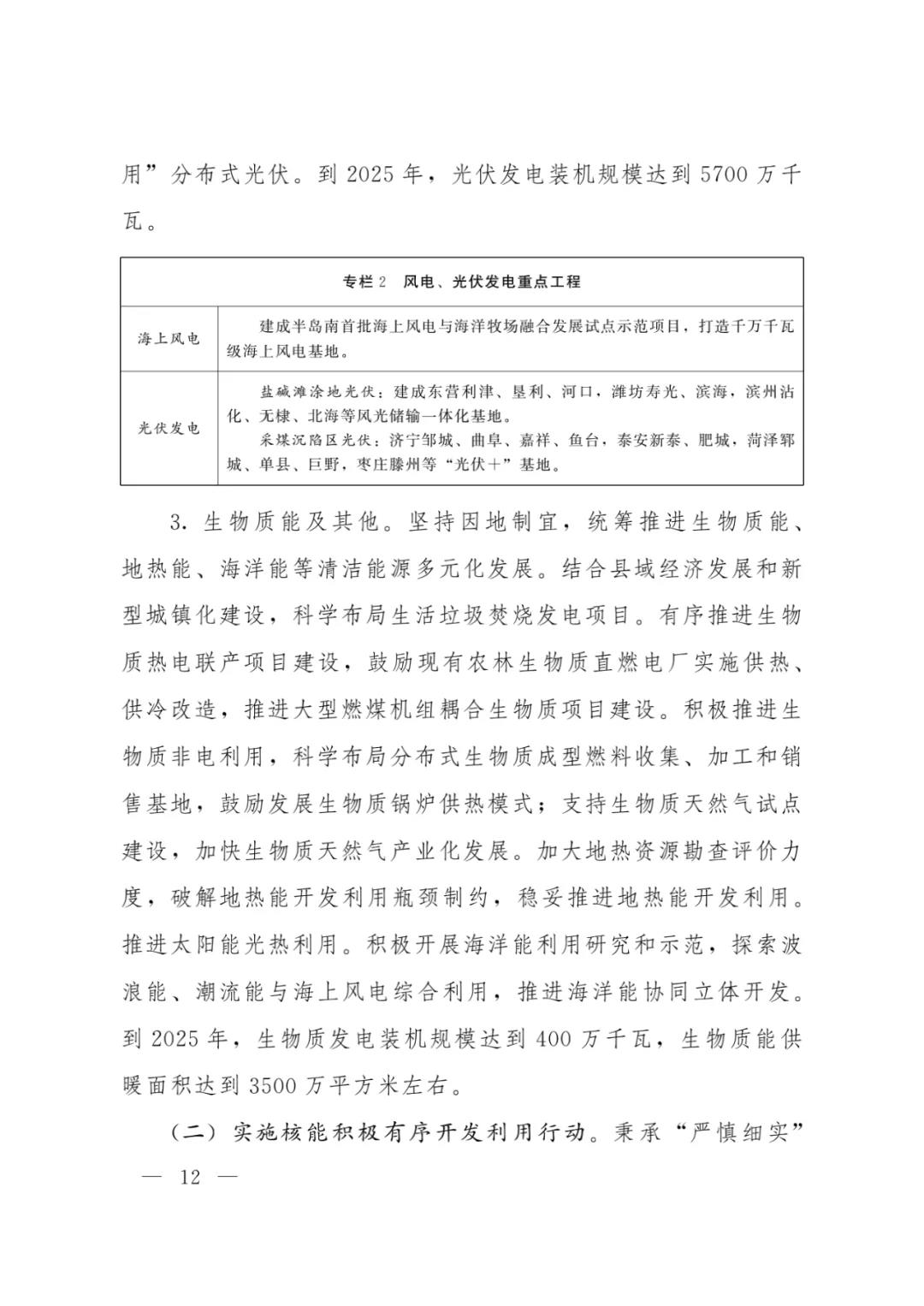 2、风电。以海上风电为主战场,积极推进风电开发。加快发展海上风电。按照统一规划、分步实施的总体思路,坚持能建尽建原则,以渤中、半岛南、半岛北三大片区为重点,充分利用海上风电资源,打造千万千瓦级海上风电基地。