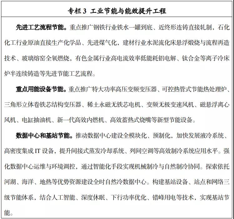 提高能源利用效率。加快重点用能行业的节能技术装备创新和应用,持续推进典型流程工业能量系统优化。推动工业窑炉、锅炉、电机、泵、风机、压缩机等重点用能设备系统的节能改造。加强高温散料与液态熔渣余热、含尘废气余热、低品位余能等的回收利用,对重点工艺流程、用能设备实施信息化数字化改造升级。鼓励企业、园区建设能源综合管理系统,实现能效优化调控。积极推进网络和通信等新型基础设施绿色升级,降低数据中心、移动基站功耗。